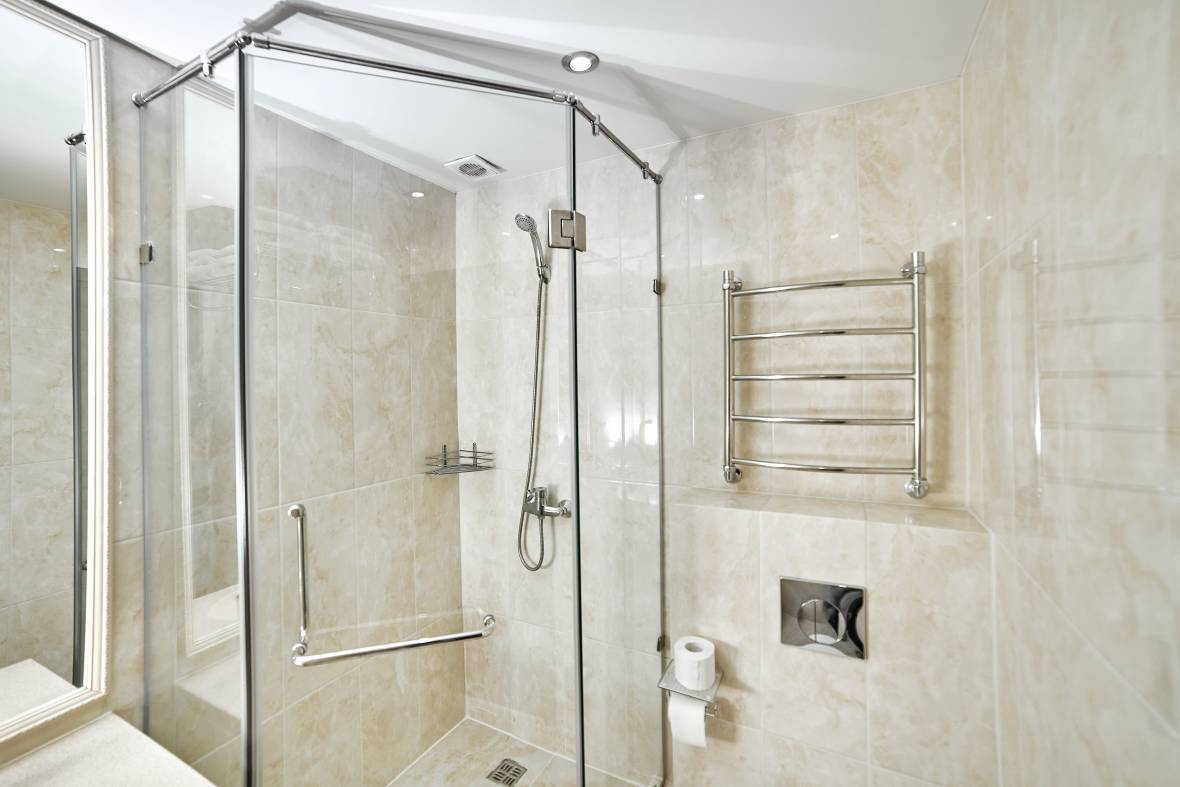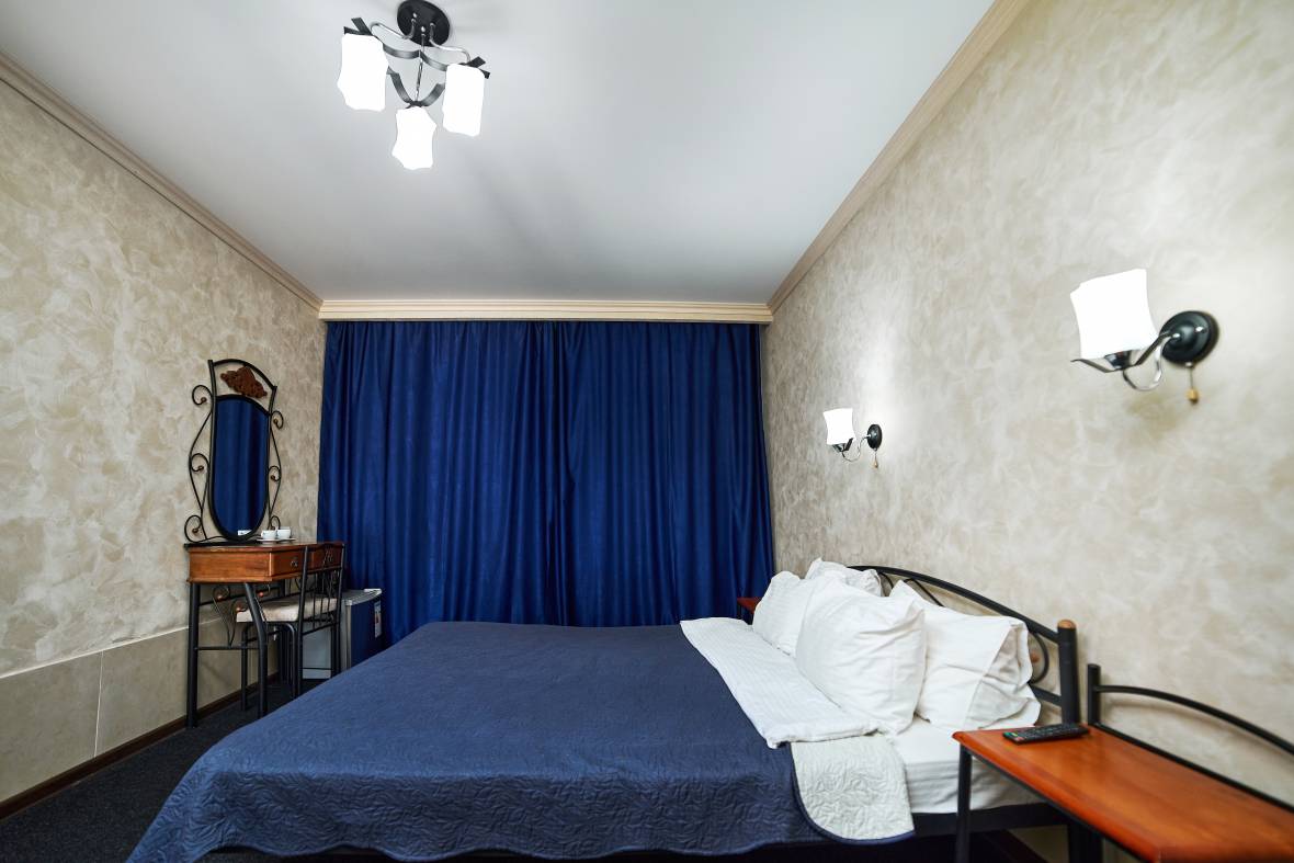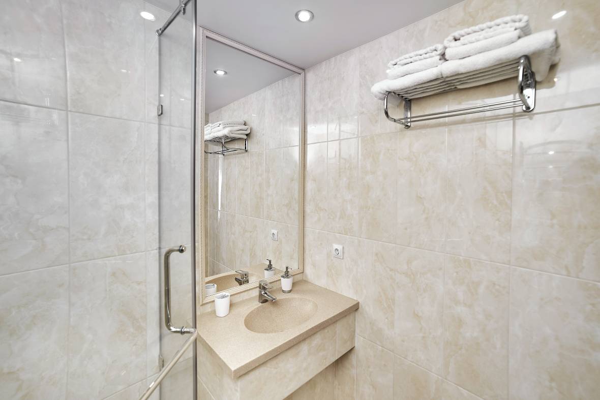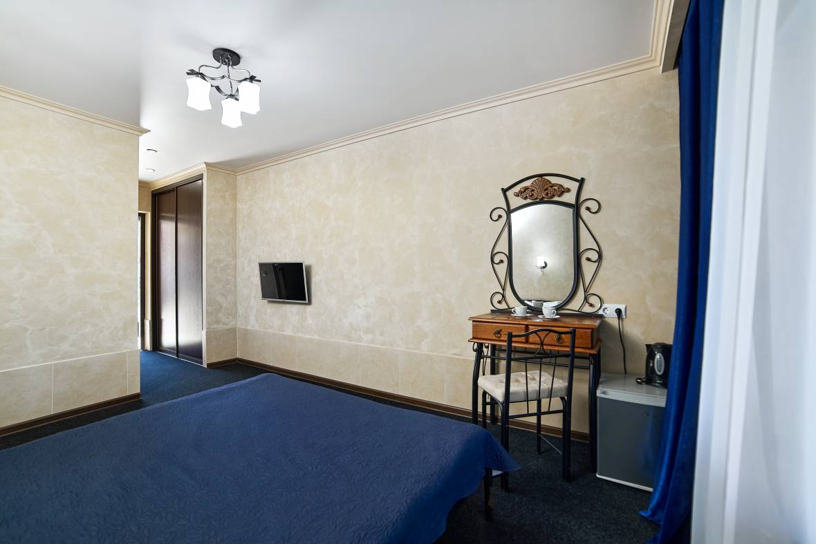 В номерах: двухспальные кровати, прикроватные коврики, две тумбочки, шкаф, чайник, холодильник, телевизор, фен, унитаз, раковина, душевая кабина