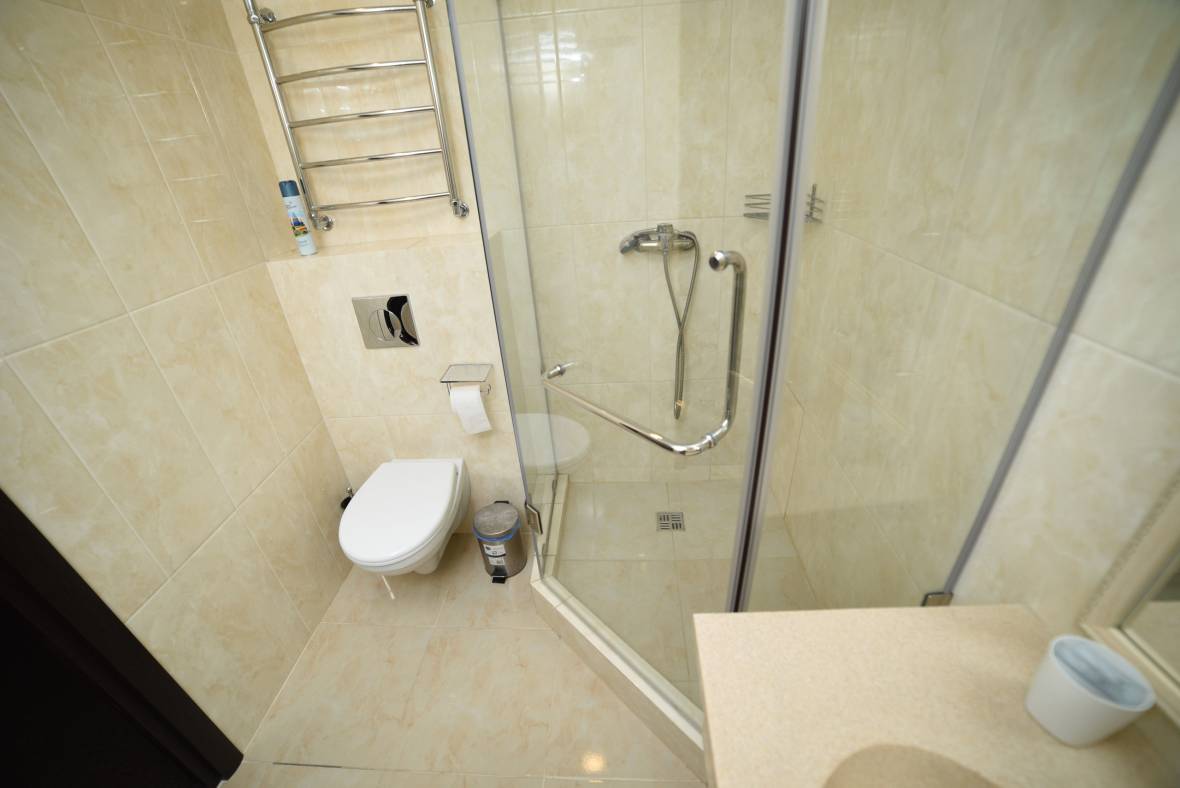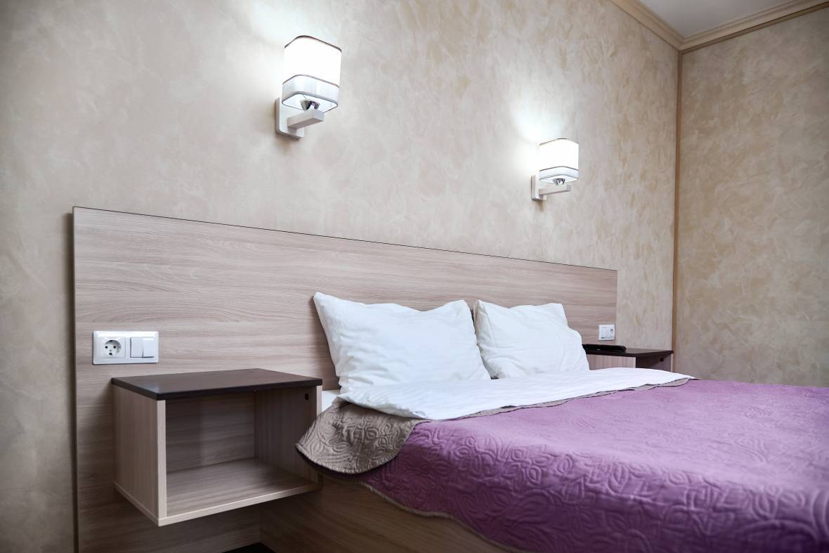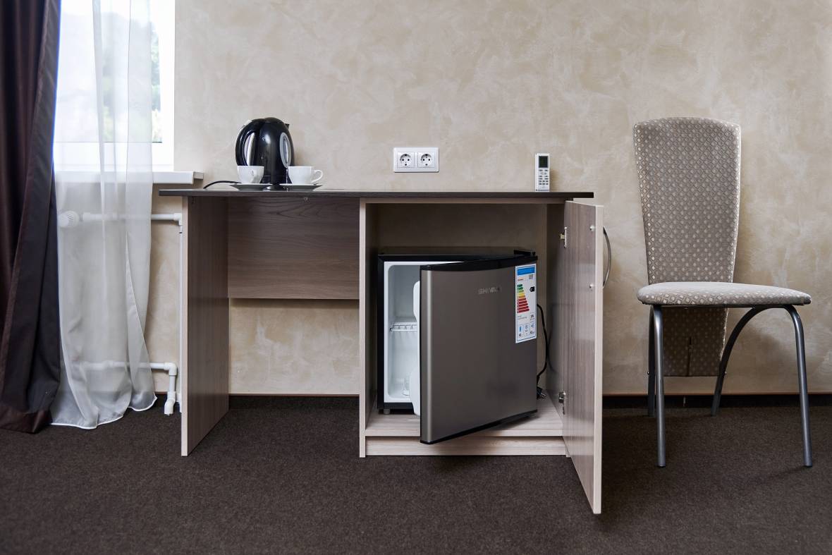 В номерах: двухспальные кровати, две тумбочки, шкаф для одежды, стол, стул, чайник, холодильник, телевизор, фен, раковина, унитаз, душевая кабина